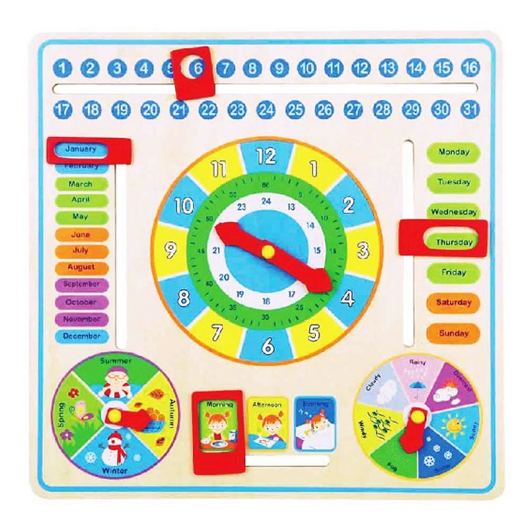 Управление временем – целое искусство. Ребенок учится ему постепенно. Обычно детям трудно сопоставить разные отрезки времени (дни, сезоны, месяцы). В таком случае хорошим пособием станут часы календарь. В центре плаката – большой циферблат. На них нанесены цифры в формате 12/24/60 (есть деления для минутной стрелки). На периферии деревянного пособия – тематические картинки с бегунками. Можно отмечать, какая сейчас погода, месяц, день, время года. Часы-календарь на английском языке от ТМ Viga Toys – легкое пособие для обучения алфавиту и цифрам. Прекрасная игрушка для языковых курсов, школ, студий. Использовать ее в можно и в домашнем обучении!