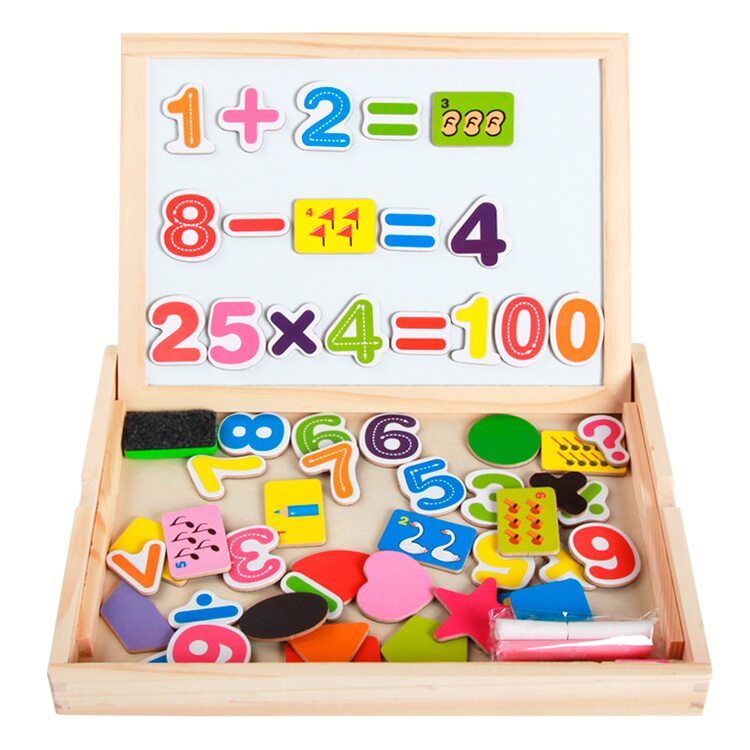 Деревянная досточка с деревянными магнитными цифрами и знаками, геометрическими фигурами. Универсальный набор для знакомства с фигурами и, цифрами. На досточке можно рисовать или писать маркером (идет в комплекте).