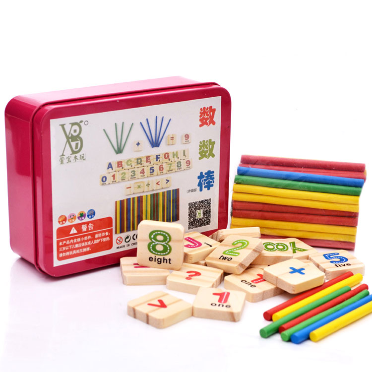 В металлической коробочке есть все для того, чтобы познакомится с цифрами и научится считать. Практическое пособие состоит из деревянных плашек с изображением цифр, знаков и разноцветных счетных палочек, а также плашек с изображением букв английского алфавита.