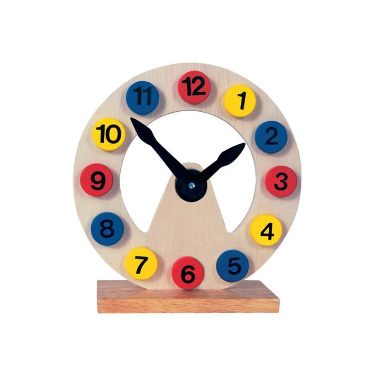 Деревянные настольные часы станут помощником для ребенка в определении времени. Играя, ребенок сможет научиться правильно определять время, познакомится с временными понятиями: час, минута, четверть часа, секунда и др. Цифры на циферблате окрашены в три цвета красный, желтый и синий, которые сменяются поочередно по ходу стрелок часов.