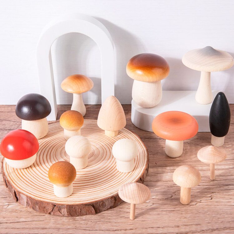 Грибочки из дерева, разного размера, удобно помещаются в ладошку малыша. Яркие шляпки округлой формы надежно закреплены на устойчивых ножках. Поверхность изделий покрыта прозрачным безопасным лаком.