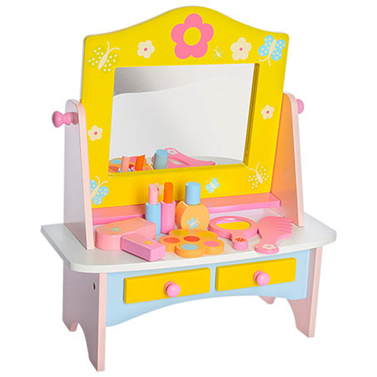 Деревянное трюмо – отличный выбор для девчонок, которые предпочитают книжкам и мультфильмам наряды и украшения. Малышка всегда готова позаимствовать из маминой коллекции пару блестящих вещиц "на время", а вот увидеть себя - ей сложно, так как проблематично дотянуться до большого зеркала. Но с игрушечным деревянным трюмо ситуация сразу изменится!