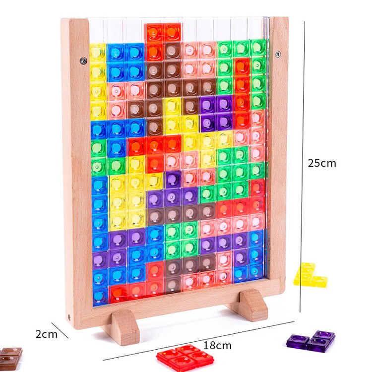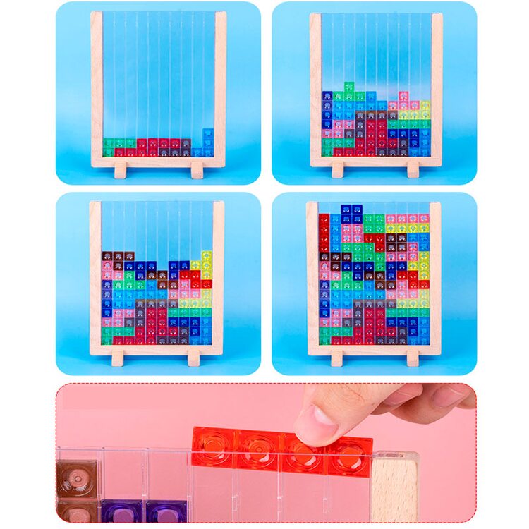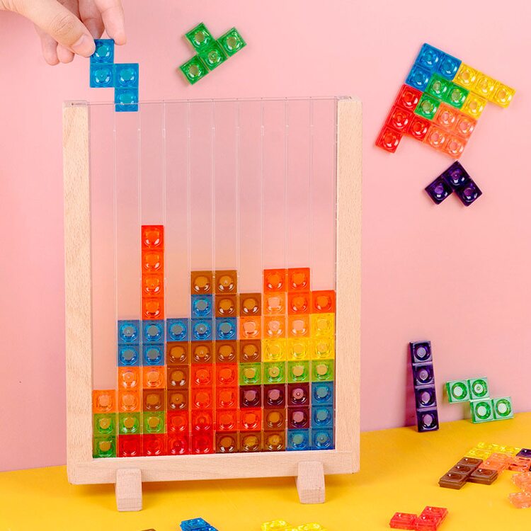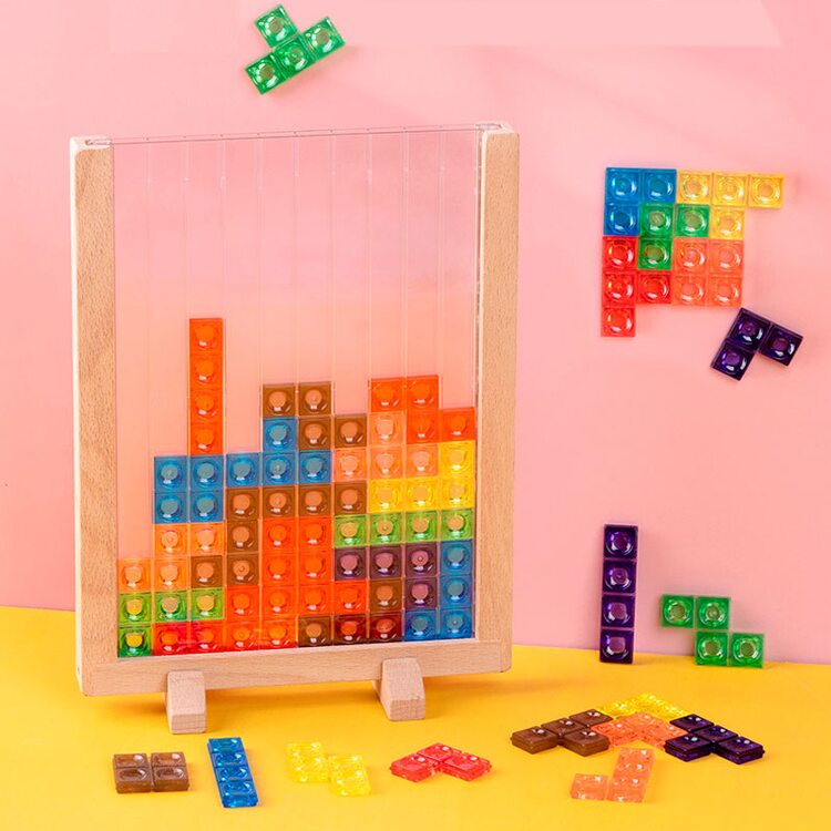 На смену электронного варианта игры с блоками "Тетрис" пришла игра для малышей в деревянном варианте с цветными пластиковыми деталями. Играя, ребенок учится думать, подбирать детали таким образом, чтобы заполнить все пространство рамки. Детали можно сортировать по видам, цветам, считать их, выкладывать различные схемы и узоры.