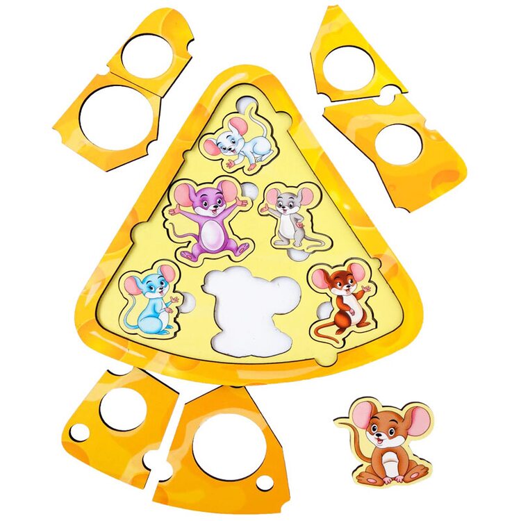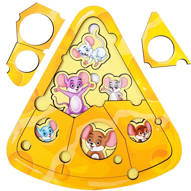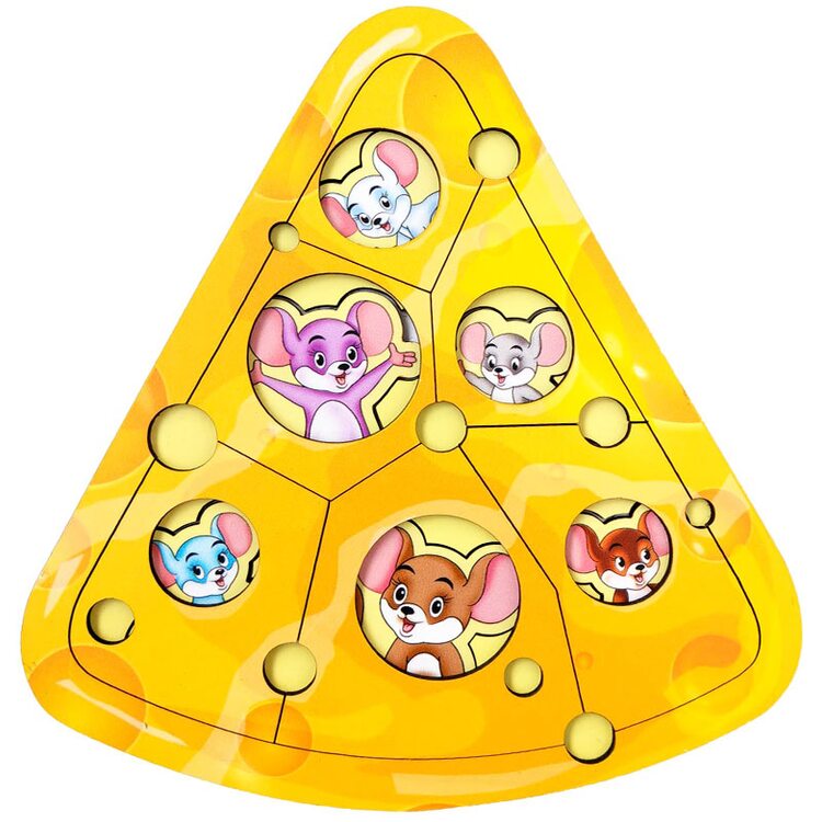 "Сырная" головоломка с мышками. Игра представляет собой двуслойную головоломку в виде кусочка сыра. Верхний шар - кусочки сыра различной формы 6 шт., нижний шар - мышата-вкладыши, которые выглядывают с дырочек.