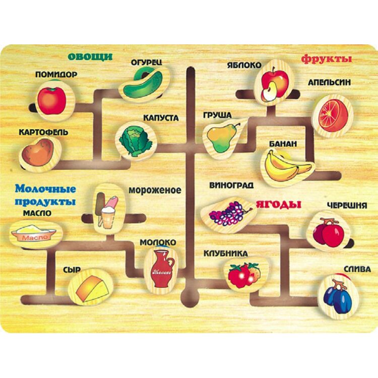 Задача малыша, в данном случае, взять маленькую деталь, установить ее в самом начале лабиринта и провести к соответствующей надписи. Таким образом, дети узнают, как выглядит тот или иной продукт, а так же выучит его наименование. Стоит отметить, что некоторые продукты расположены на дощечке таким образом, что если ребенок не заполнит все ниши, находящиеся позади них, то ему придется выводить этот элемент из лабиринта и закрывать пустующие ниши.