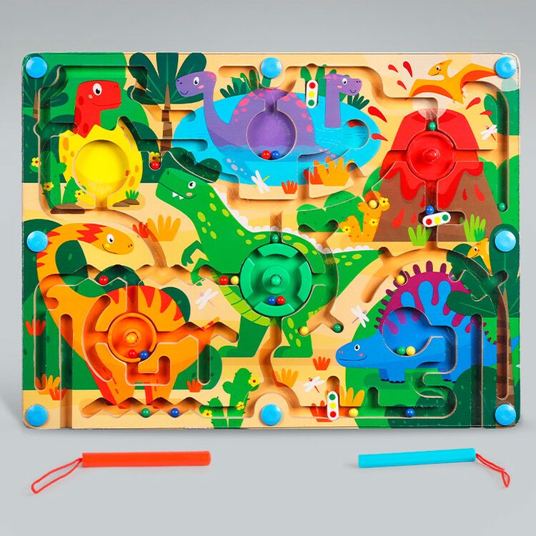 Малыш любит азартные игры? Порадуйте его магнитным лабиринтом «Планета динозавров»! В комплект входит стилус, с помощью которого нужно ловить цветные шарики. Правда, вытащить их из корпуса игрушки не получится. Необходимо перемещать элементы вдоль дорожек.