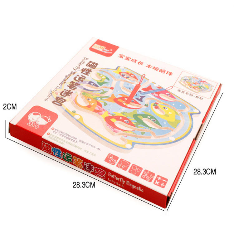 Лабиринт выполнен в виде аквариума с рыбками и дорожками, по которым нужно передвигать разноцветные шарики. Шарики нужно передвигать с помощью магнитных палочек (входят в комплект).