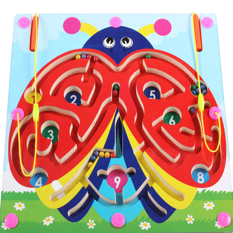 Лабиринт с магнитным стилусом и шариками. На деревянном основании нарисованный жук со множеством дорожек-ходов и ячейками с цифрами от 1 до 9. Играя, знакомимся с цифрами и учимся считать с помощью разноцветных шариков.