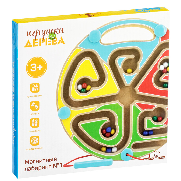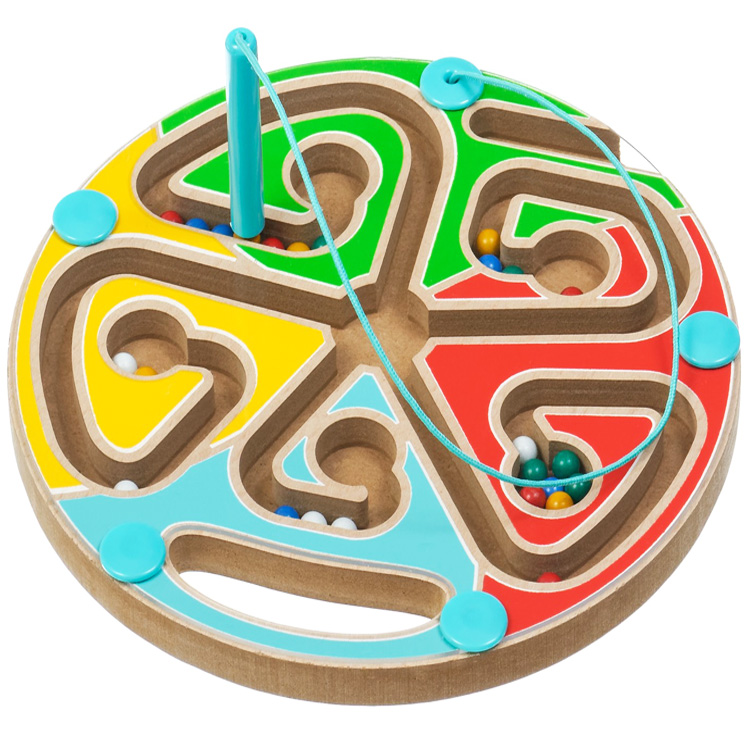 Представленная разновидность лабиринта недавно появилась на рынке детских игр. Магнитный лабиринт "Круг" - классический по форме, но с новым принципом игры. Шарики не берут руками и не перекатывают по доске. Для них есть специальная магнитная "ручка" - стилус. С помощью ручки нужно провести все шары по пазам, вырезанным в деревянной дощечке, к пяти отверстиям. Магнитный лабиринт "Круг" заинтересует ребенка, у которого уже развита моторика кисти и пальчиков, а если этот навык развит слабо, игра поможет его улучшить и научит ребенка более уверенно обращаться с мелкими предметами.