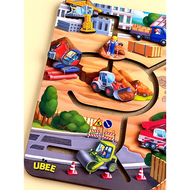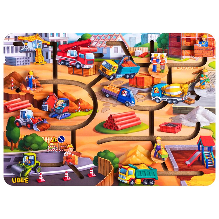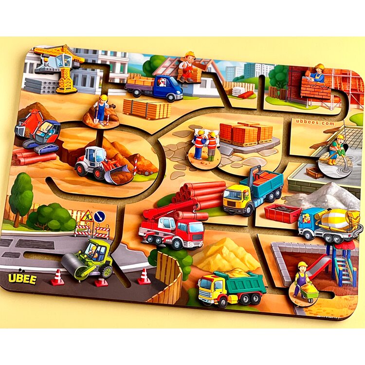 Объемные фигурки транспорта, которые используют в строительстве зданий, сооружений, дорог: каток, бульдозер, бетономешалка, грузовик и др. Автомобили нужно передвигать по дорожкам лабиринта, чтобы найти каждой машинке свою дорожку согласно функций, которая она выполняет: манипулятор - на платформу с выгрузкой стройматериалов, самосвал - на платформу для выгрузки сыпучих материалов и т.д. На основании разместилось 9 автомобилей и 6 строителей, каждый из которых выполняет свою работу.