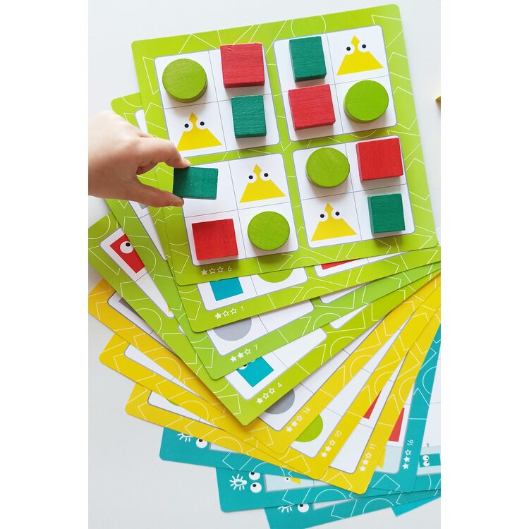 В набор входят 16 цветных геометрических фигур по 4 каждого вида: квадрат, круг, прямоугольник, треугольник, а также 10 двусторонних карточек с заданиями 3-х уровней сложности. Детали можно считать, сортировать по цвету, виду, использовать как конструктор.