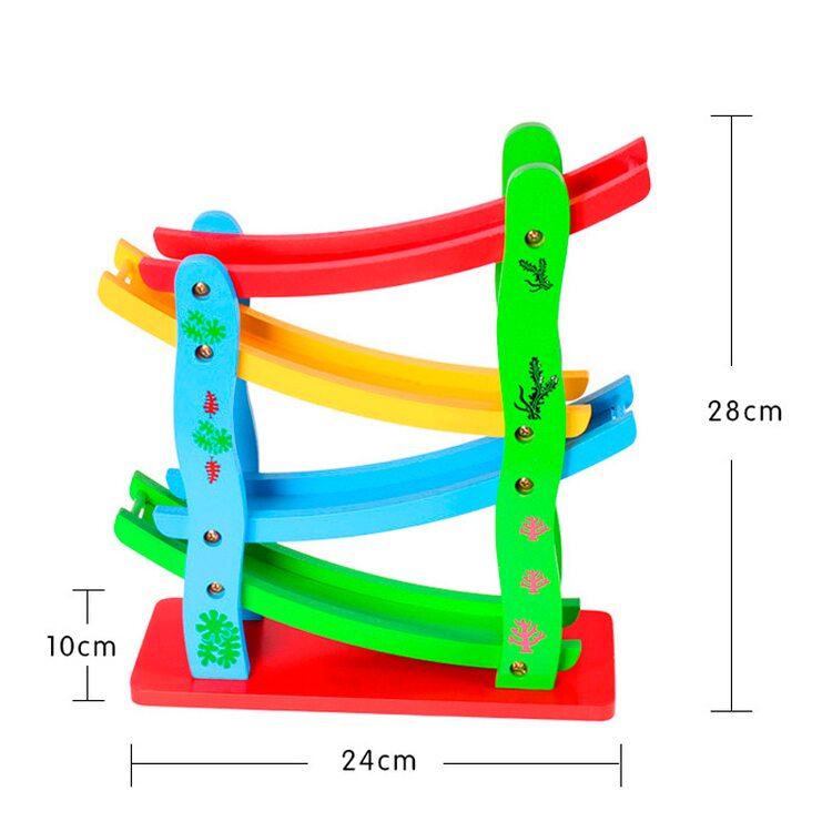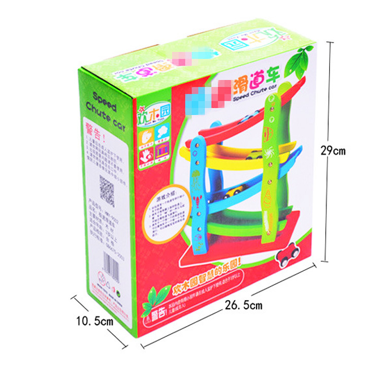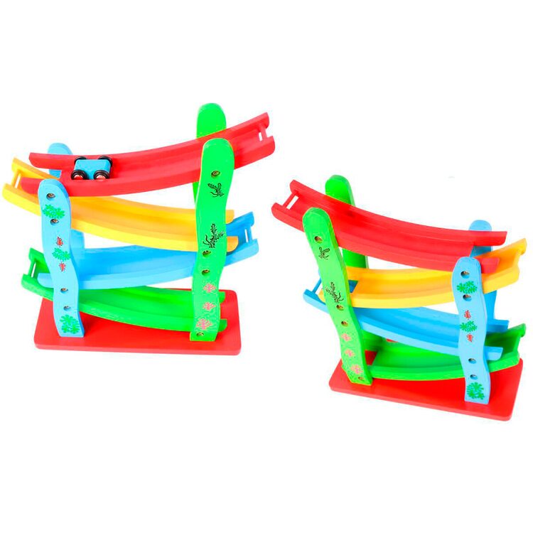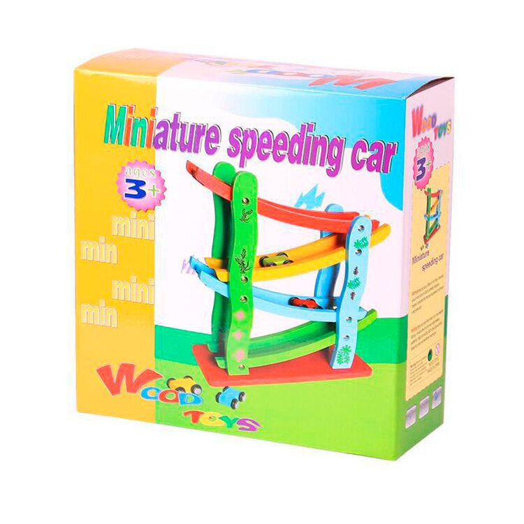 Автотрек «Скоростная машина» – игрушка для маленьких, но любознательных деток. Наблюдая за гонками, они улучшают глазомер, учатся соизмерять силу запуска и скорость движущегося предмета. Горки внутри конструкции расположены под разными углами. Значит, автомобильчики будут двигаться с разной скоростью. Обратите на это внимание малыша. Красная горка – самая быстрая, зеленая – медленная.