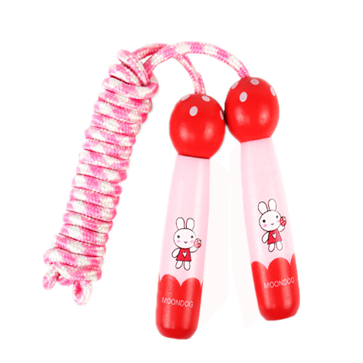 Скакалка с красивыми, прочными деревянными розовыми ручками с нарисованным зайкой.