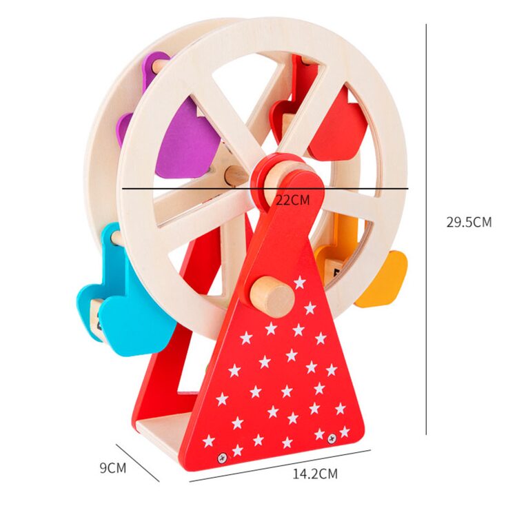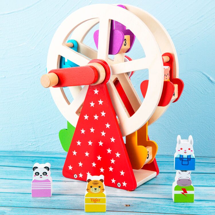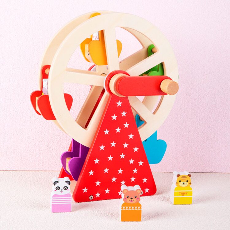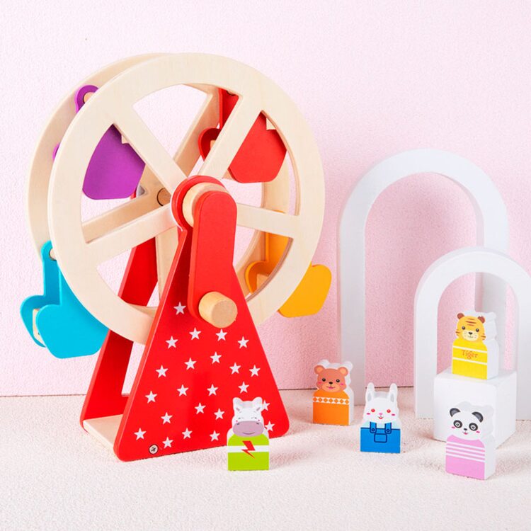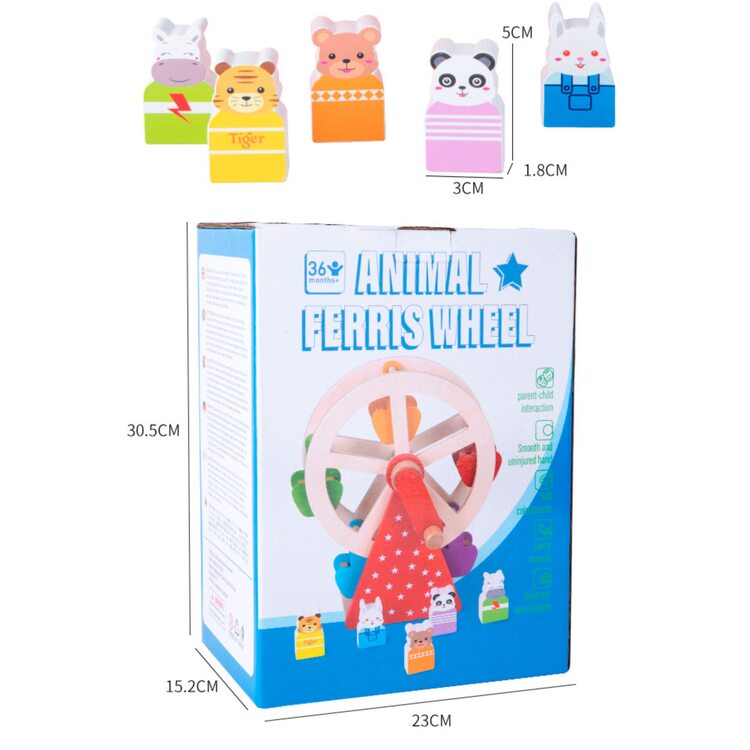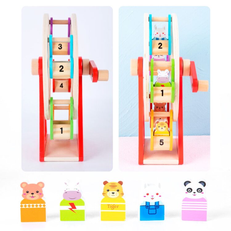 Интересная деревянная игра с животными, которые катаются на качели с большим поворотным механизмом. Для того, чтобы колесо обозрения начало свое движение его нужно "завести" с помощью ручки, которую можно крутить в сторону движения часовой стрелки, так и в обратную. Играя, малыш следит глазками за кабинками с животными, который двигаются по кругу развивая визуальное восприятие.