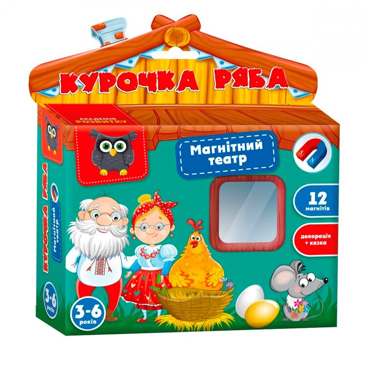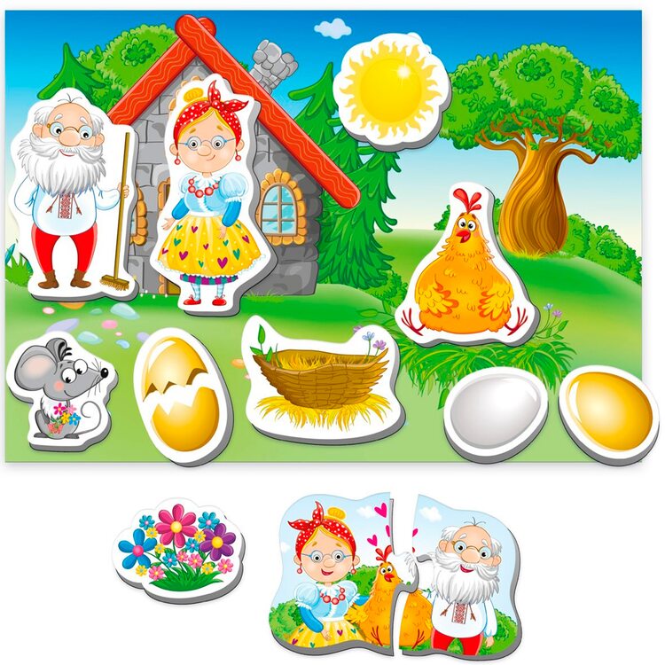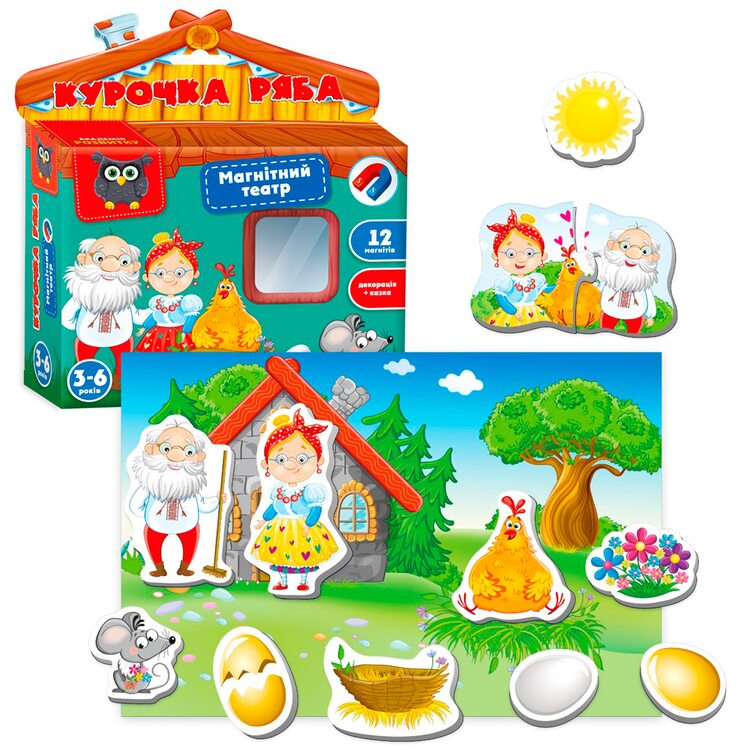 Одной из первых детских сказок, которую читает или рассказывает на ночь папа или мама, есть поучительное повествование «Курочка ряба». Когда малыш уже наизусть выучит содержание сказки, ему пригодится Магнитный театр «Курочка Ряба», чтобы весело поиграть и по памяти воспроизвести все сказочные события. Незамысловатый сюжет легко интерпретировать в веселую сценку, где дед и баба все никак не могут справиться с золотым яичком. Только шустрой мышке удалось разбить яйцо, чем немало огорчить семейство. Ребенок с удовольствием будет играть в компании родителей или старших братьев или сестер, принимая активное участие в забаве.
