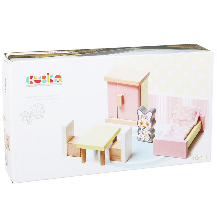 Деревянная спальня-детская с крошкой Зайкой. К набору деревянной мебели входят: шкаф, кровать с подушкой и одеялом, стол и два стула. В комплект также входят 8 магнитных платьев для Зайки.
