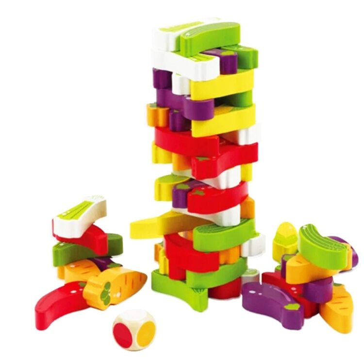 Деревянную настольную игру "Дженга" называют еще и "Vega". Из бревнышек нужно построить башню и поочередно вынимать детальки с строения, но так , чтоб сооружение не упало. Выигрывает тот, у кого получилось не поламать, а хотя бы оставить как есть. Оригинальным в данном наборе есть то, что бревнышки выполнены в виде фруктов и овощей. Играя, ребенок сможет познакомится с фруктами и овощами, сможет сортировать, считать, называть по названиям и др.