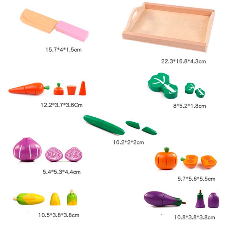 Деревянный набор овощей, которые можно разрезать на две-три части с помощью специального деревянного ножа. В наборе 7 овощей, нож и поднос.