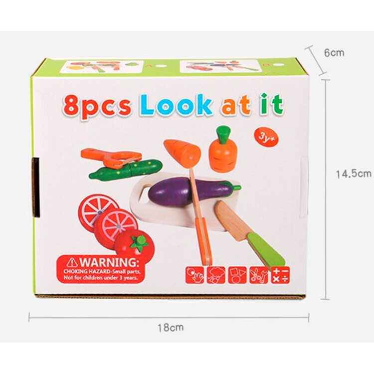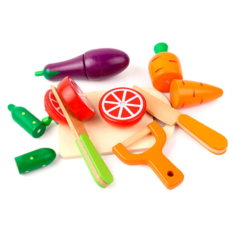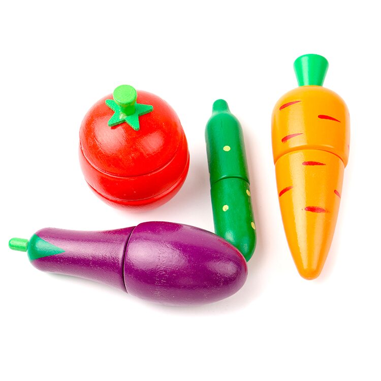 Набор овощей, которые можно разрезать на части с помощью специального деревянного ножа. Части овощей соединены между собой магнитом.