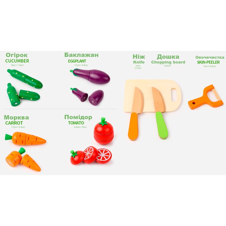 Комплект разрезаемые овощи «Салат» от ТМ Dabitoy состоит из удобной деревянной разделочной доски и совершенно безопасного кухонного аксессуара – ножа (в наборе 2 шт.), а также овощечистки. Овощи легко режутся пополам, так как скреплены внутри магнитом. Сделать овощной салат дело нескольких минут. Попутно кроха изучит все оттенки цвета, сможет сосчитать количество ингредиентов для салата, супа, борща или другого блюда из составленного меню.