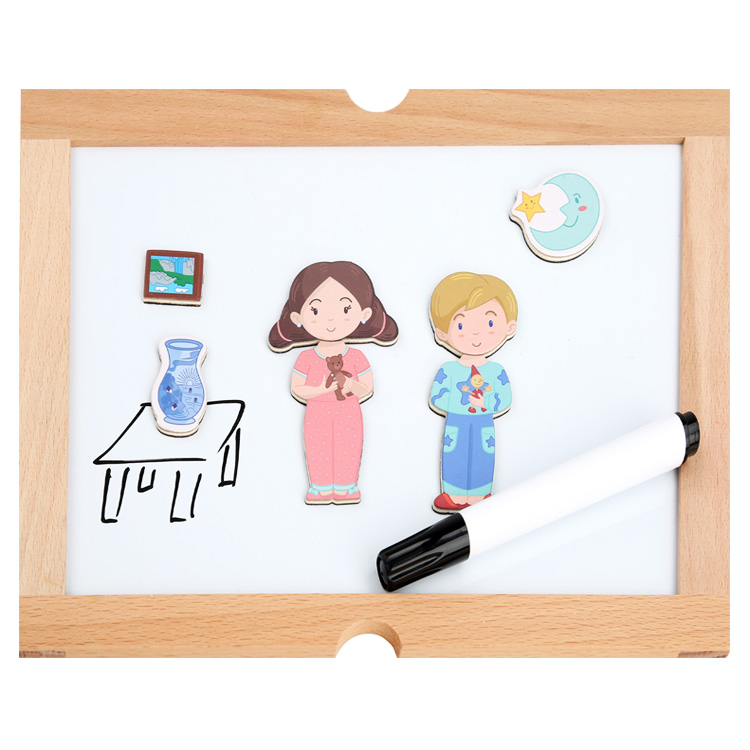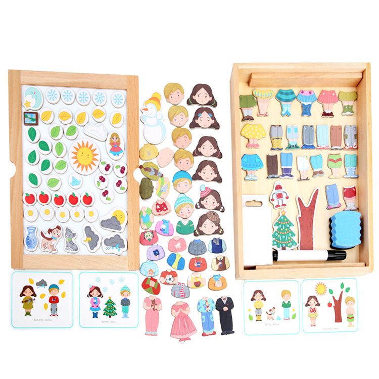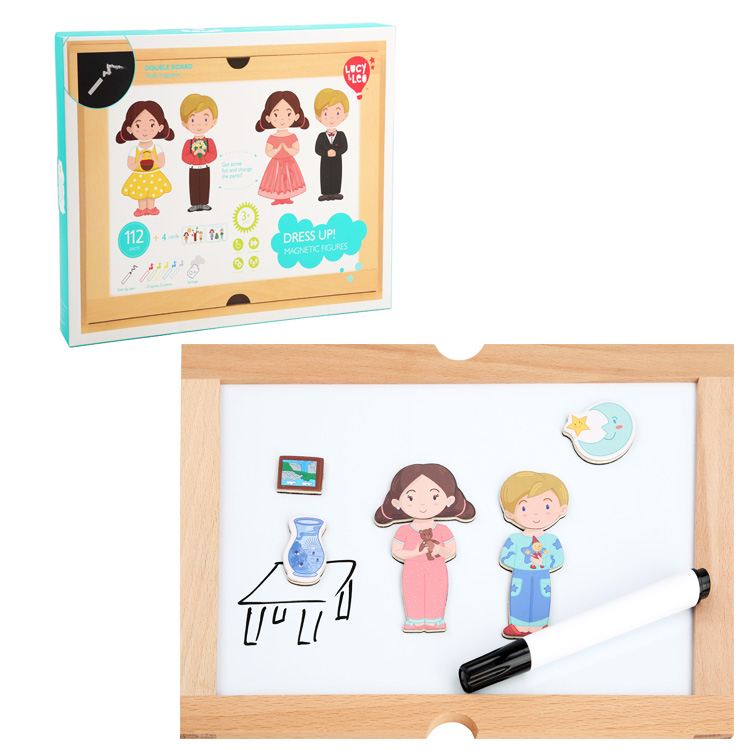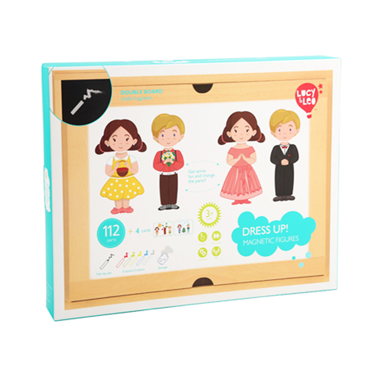 Комплектация: деревянный ящик с двусторонней доской для мела и магнитных игр, 112 деталей, 4 карточки, набор мела - 10 мелков, маркер на водной основе, губка для стирания.