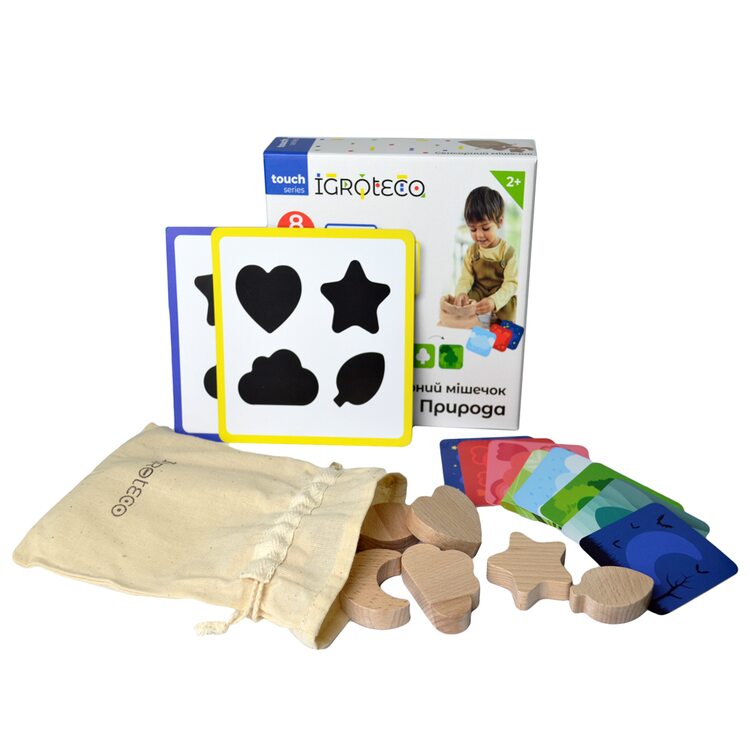 В сенсорном мешочке "Природа" (неокрашенный) 8 фигур, 2 карточки с картинками этих же фигур в черном варианте, а также 8 двухсторонних мини-карточек в цветном варианте и мешочек с х/б ткани. Варианты игр Вы сможете найти на картонной коробке, которые помогут Вам в проведении развивающих занятий.
