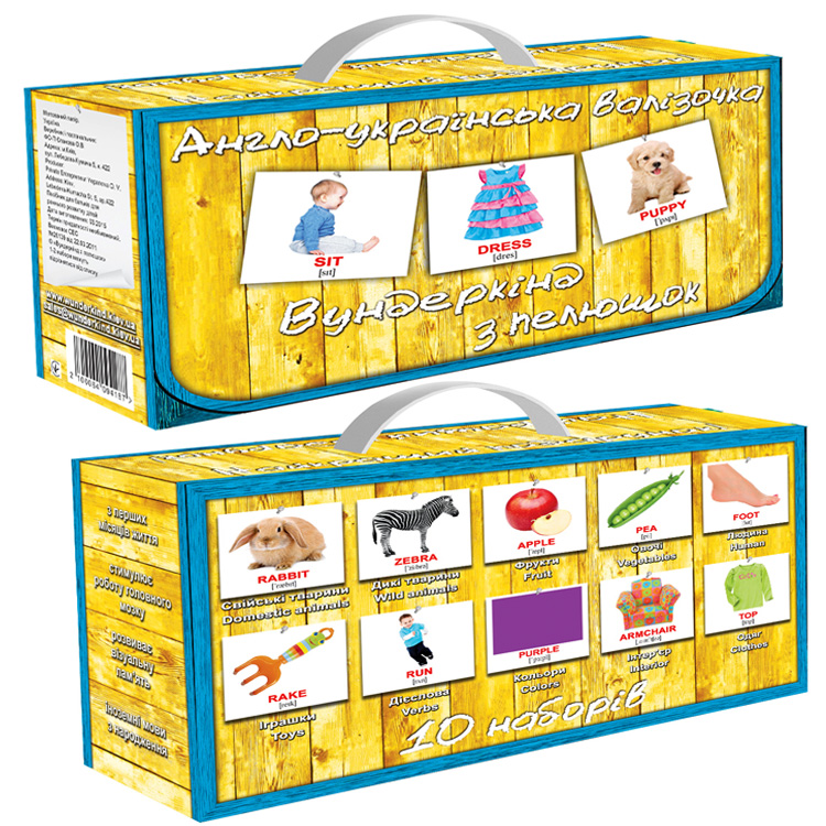 Незаменимым пособием для развития внимания и интеллекта станет подарочный набор цветных двуязычных карточек. В компактном чемоданчике 10 комплектов (400 карточек) на разнообразные темы. Под каждым изображением есть четкая надпись – с одной стороны на английском, с другой – на украинском языке.