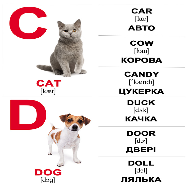 В наборе карточек «Алфавит», анг-укр включено 26 буквенных образцов с пояснением картинками. В процессе развивающих занятий кроха будет запоминать названия слов и вслух их повторять. Малышу обязательно следует помочь в освоении новых знаний. Часто ассоциативное мышление помогает расширить свой словарный запас причем сразу словами из нескольких языков. Папы и мамы должны правильно озвучивать каждый живой или неживой предмет, чтобы малыш побыстрее усвоил тонкости произношения.