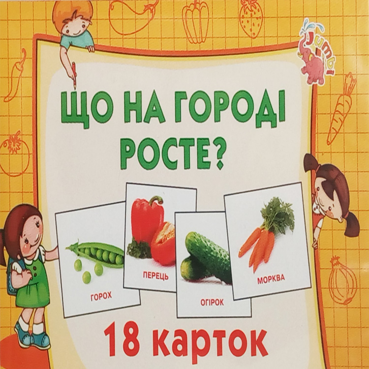 Карточки с изображением самых известных жителей огорода - овощи. В наборе 18 картинок с овощами, название которых подписаны на украинском языке.