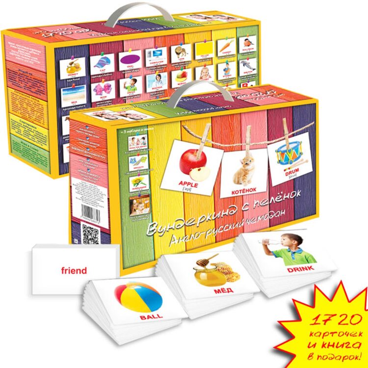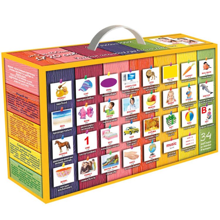 В компактном чемоданчике 34 набор (1760 карточек). Тематика охватывает почти все сферы жизни ребенка и его семьи. Все открытки в наборах однотипные: под рисунком помещено русское названия объекта, а с другой стороны – английское с транскрипцией. Хранить наборы в подобном саквояже удобно, ведь ребенок не играет всеми карточками сразу. Можно изучать темы постепенно.