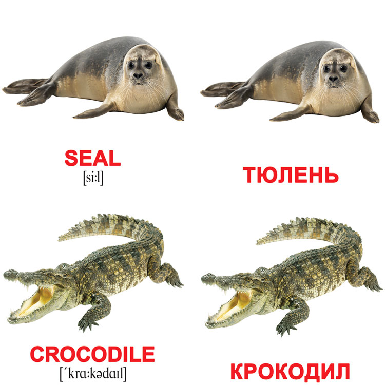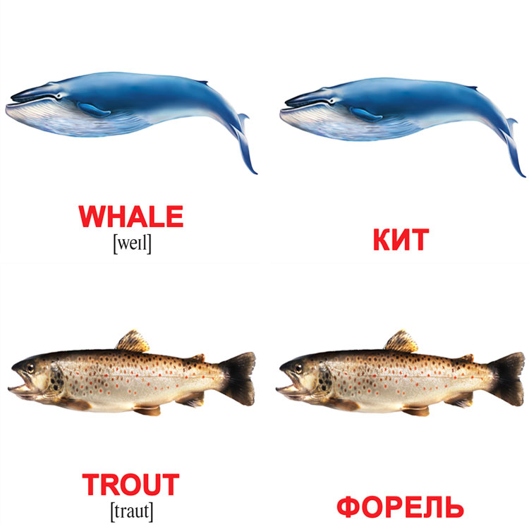 Комплект карточек с изображениями представителей водных животных на русском и английском языках. Набор состоит из 40 двухсторонних карточек. Играя, ребенок познакомится с животными, усвоит тему о водных животных, пополнит свой словарный запас русскими и английскми словами, сможет зрительно запомнить как пишутся слова (фотографическая память).