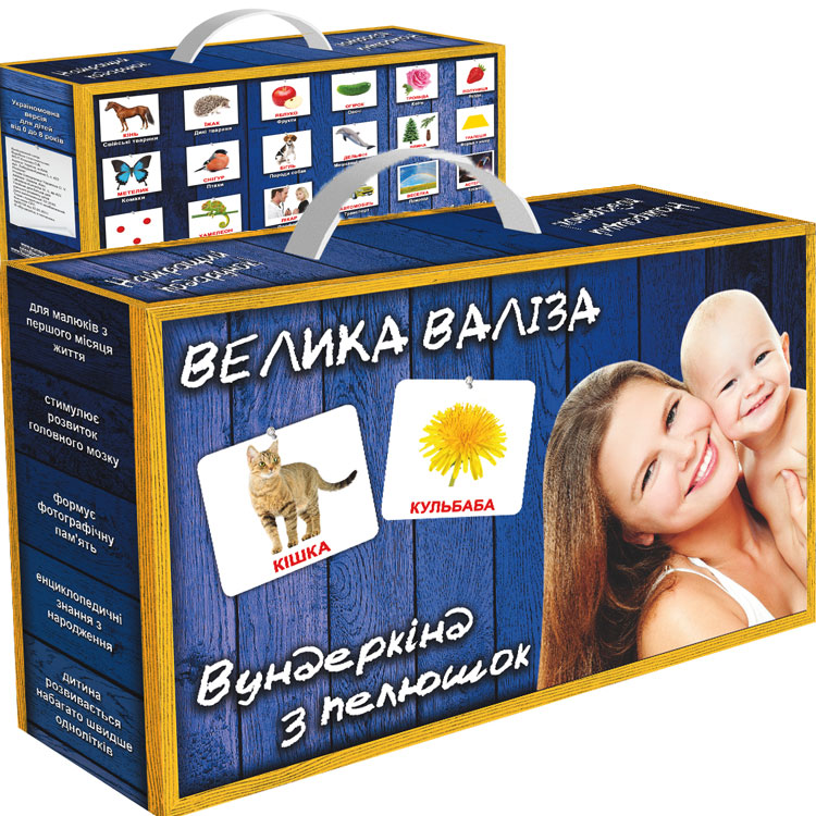 Подарочный набор с большим количеством тематических карточек с интересными фактами и заданиями на украинском языке. карточки изготовлены с прочного картона с ламинацией, что очень удобно и долговечно для частого использования. Чемоданчик состоит из 21 набора больших карточек различных тематик, а также книги "Как вырастить вундеркинда", которая идет в подарок.