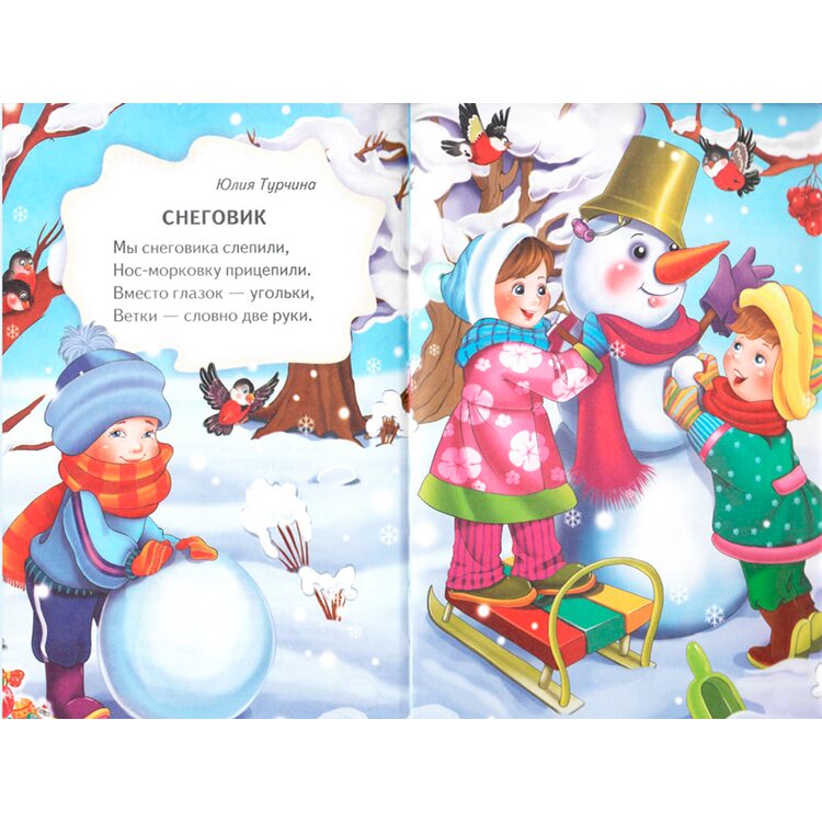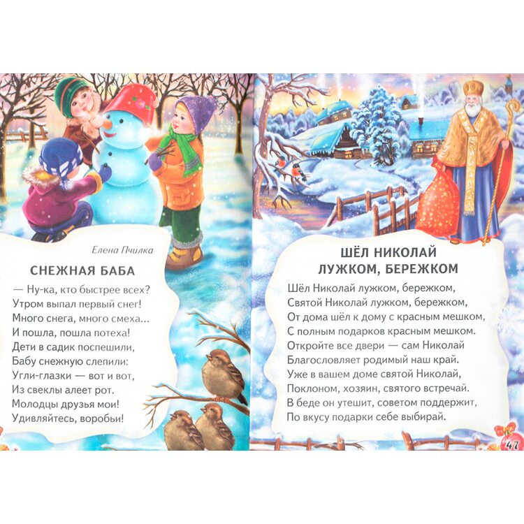 Сборник стихов новогодней тематике с красивыми рисунками, а также сказками "Госпожа метелица" и "Два Мороза". Книга на русском языке с большим, удобным для чтения шрифтом.