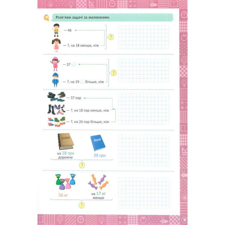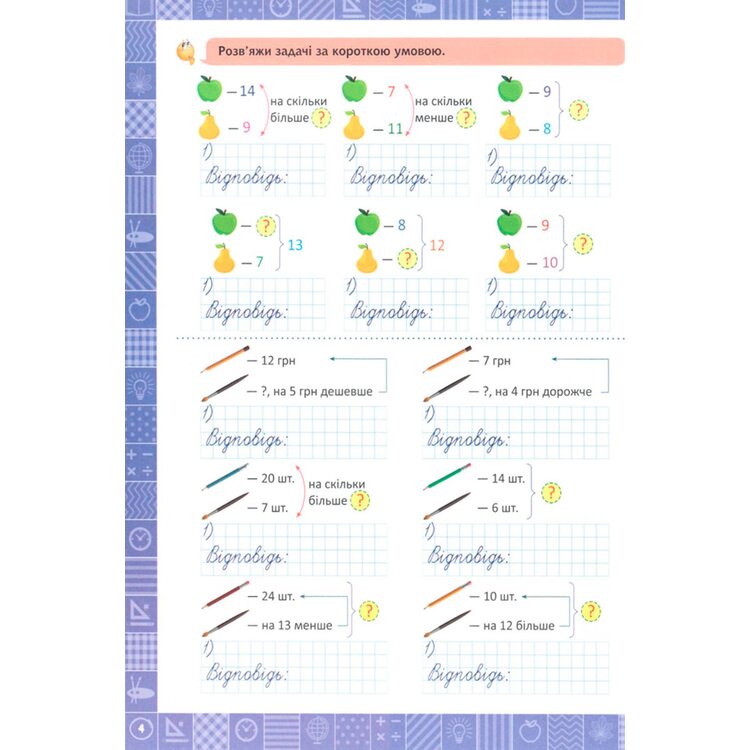 Задачи сопровождаются наглядными рисунками, которые помогут ребенку в решении заданий. Решая задачи, ребенок учится анализировать, моделировать, логически мыслить, вычислять, работать с данными.
