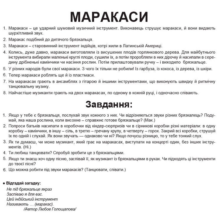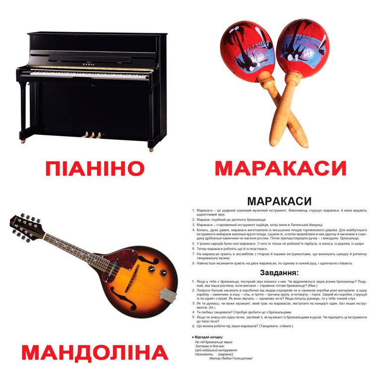 Набор карточек с интересными фактами о 20 музыкальных инструментах. Карточки двухсторонние с изображением музыкальных инструментов, 160 фактов о них, 140 заданий и загадок.