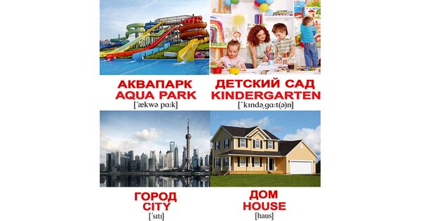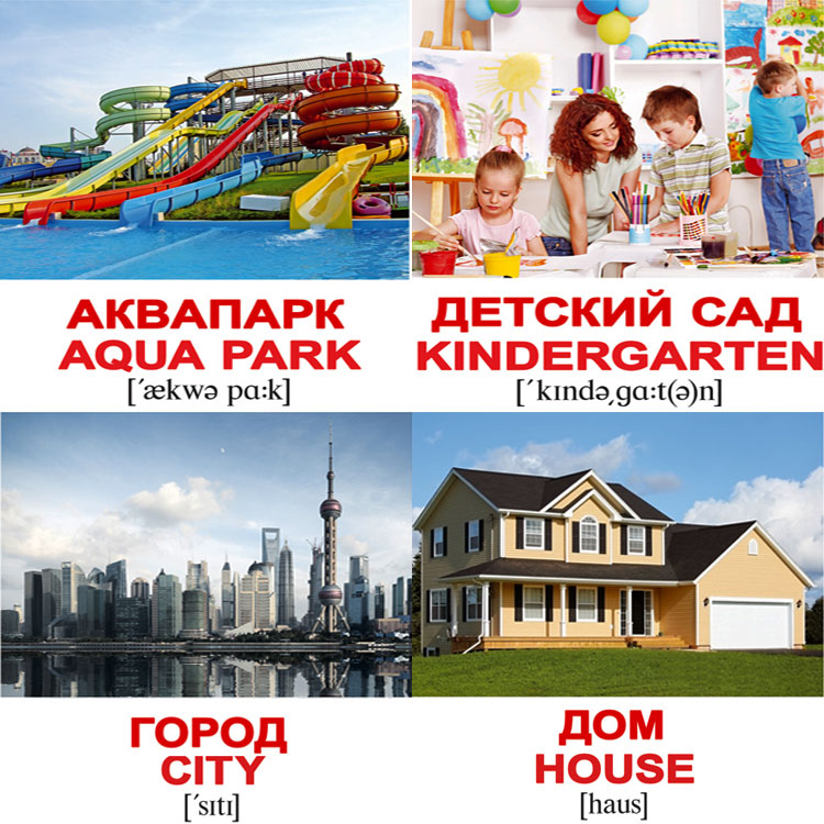Наборы в формате мини – это 40 небольших картинок, объединенных общей темой. На каждой карточке изображен 1 объект (аквапарк, город или детский сад). Внизу дается подпись на двух языках. Изображение можно держать в руках или прикреплять их по одному на магнитную доску для рисования.