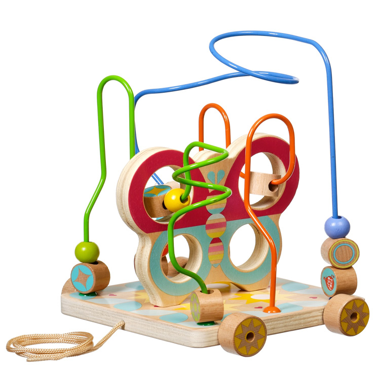 Деревянная каталка на ниточке с пальчиковым лабиринтом и объемной бабочкой. Играем весело и полезно.