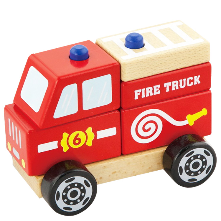 Пять деревянных деталей кузова пожарного автомобиля нанизываются на штырьки как пирамидка.