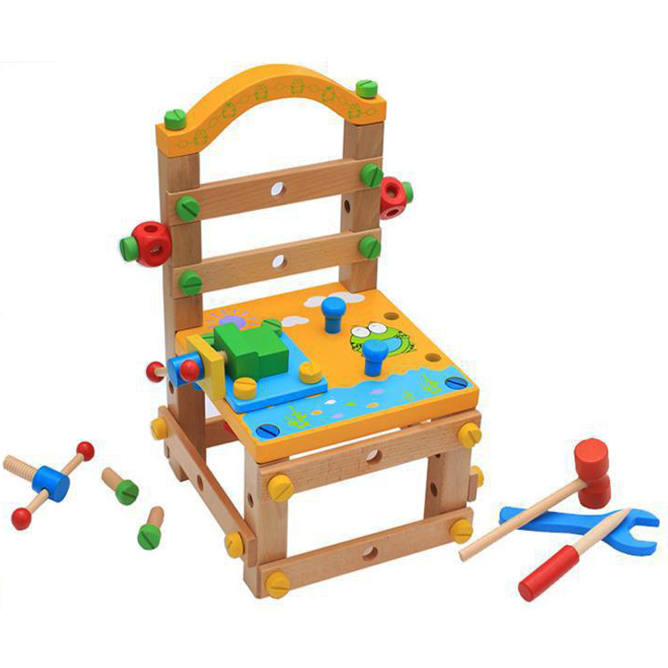 Среди деталей этого деревянного стула конструктора – болты с прямоугольной головкой, винтики, гвоздики. Соединяя основные части стула-конструктора между собой ребенок учится использовать по назначению игрушечный инструмент – гаечный ключ, отвертку, молоток. Все детали и инструменты достаточно крупные, специально созданы для отработки предметных манипуляций, трудовых умений малыша.