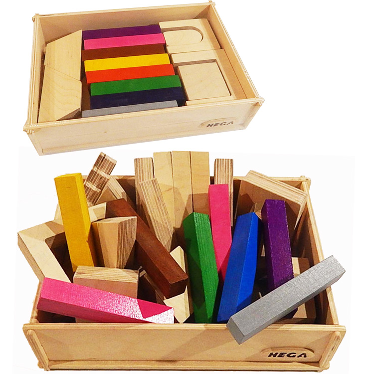Конструктор с разноцветными деталями в деревянной коробке. Играя, ребенок учится работать с деталями разной формы, подбирать и комбинировать их.