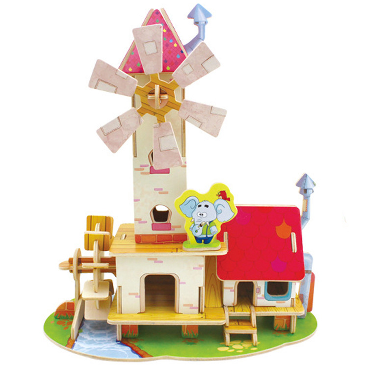 Объемный деревянный конструктор со скрепляющимися частями – несложное, но увлекательное занятие для ребенка. Когда же ему удастся собрать конструкцию, в которой будут вращающиеся детали, радости не будет конца. Мельница и домик – почти что настоящие, устойчивая этажная постройка станет декорацией ко многим сказочным историям, преобразит мир детских игр, разбудит фантазию. Населить домик-мельницу любимыми персонажами, организовать маленький театр с таким наглядным материалом не составит труда.