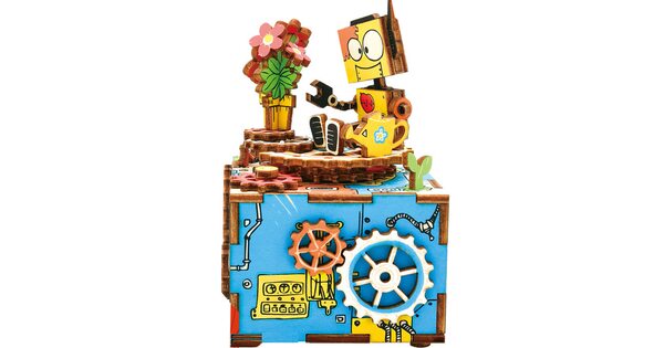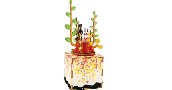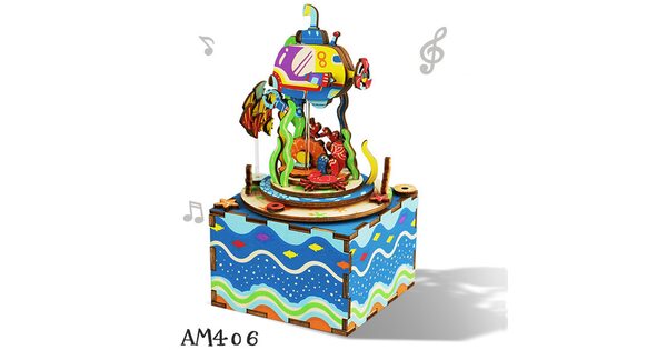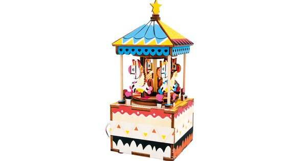 Прекрасный старинный инструмент шарманка вдохновил производителей на создание конструктора с функцией музыкальной шкатулки. Внутри коробочки «прячется» заводной механизм. Он приводит в движение карусель на крышке. При этом играет приятная мелодия.
