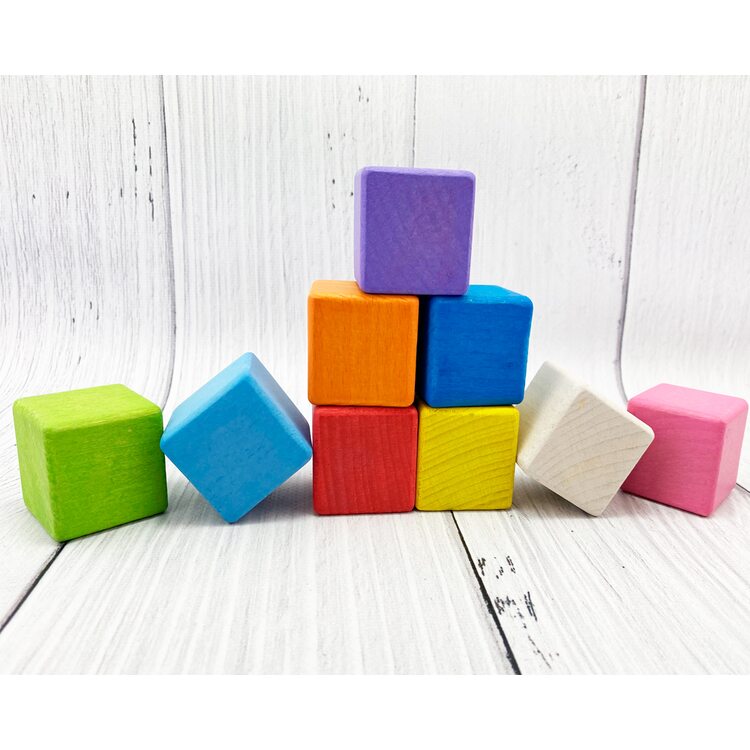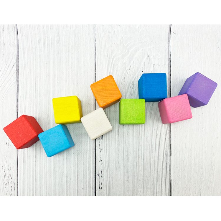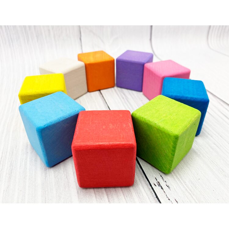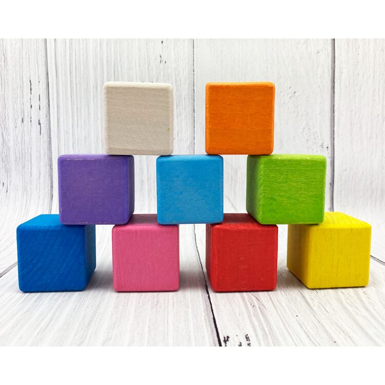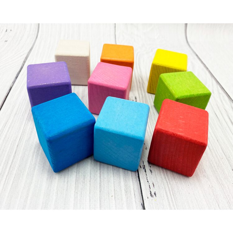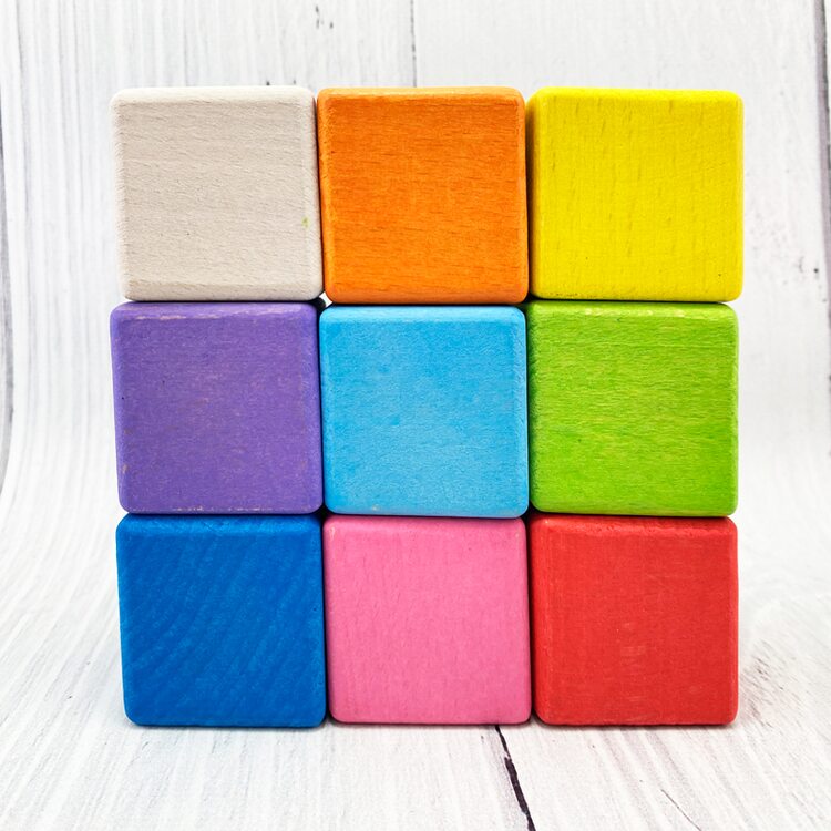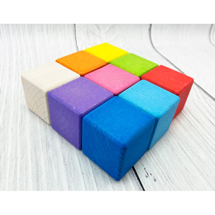 В наборе 9 цветных кубиков разных цветов: красный, желтый, синий, салатовый, фиолетовый, оранжевый, розовый, голубой и некрашеный. Играя с кубиками, ребенок развивает воображение, знакомится с цветами, учится конструировать.