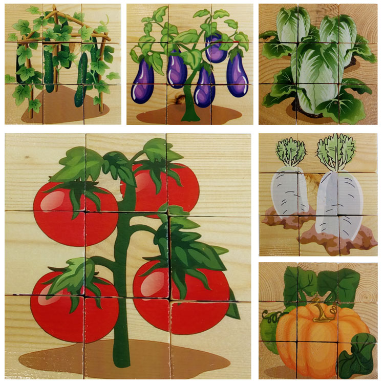 В набор входит 9 деревянных кубиков, с помощью которых без особых усилий можно сложить 6 овощей: помидоры, баклажаны, тыква, огурцы, редька, капуста.