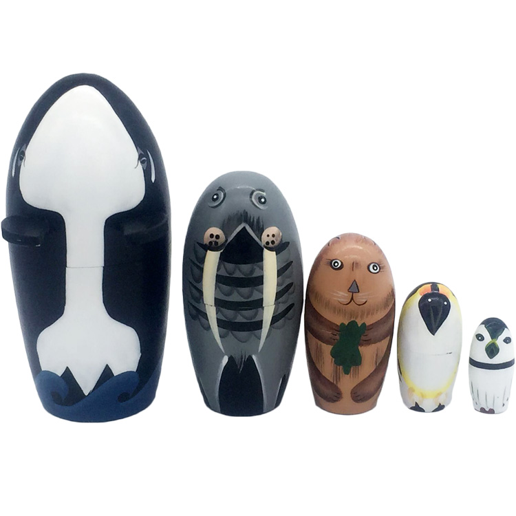 Матрешка "Арктика" дает большой простор для игры любознательному малышу. 5 фигурок символизируют различных животных: кита, моржа, тюленя, песца и маленького пингвинчика. Сделанные по принципу матрешки, фигурки отличаются размером и цветовой гаммой, но сходны по конфигурации. Это позволяет компактно складывать фигурки друг в друга.