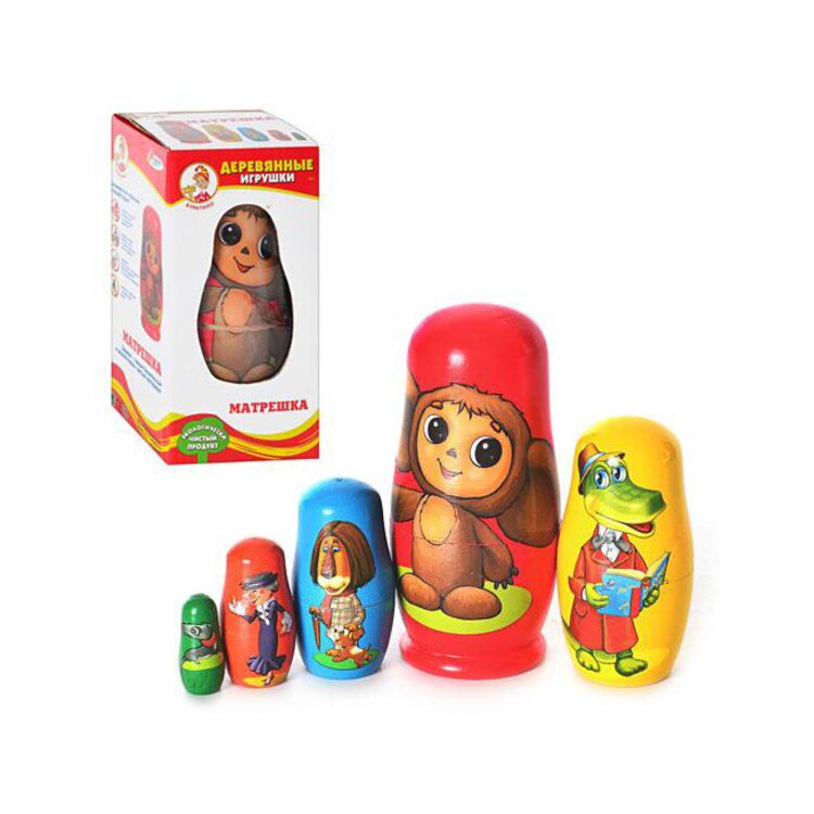 Матрешка с любимыми персонажами из мультика про Чебурашку и крокодила Гену. Ребенок не только узнает героев, но и сможет научиться собирать и разбирать матрешку, различать меньшие матрешки от больших, формируя мышление, усидчивость и память.