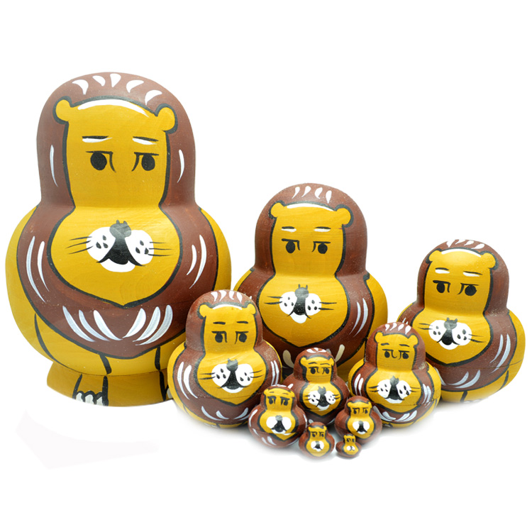 Матрешки в виде львов. В наборе 10 матрешек разного размера. С помощью такого вида матрешки, Ваш ребенок на практике разберется в понятиях "больше-меньше".