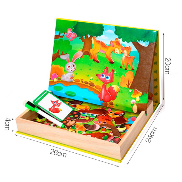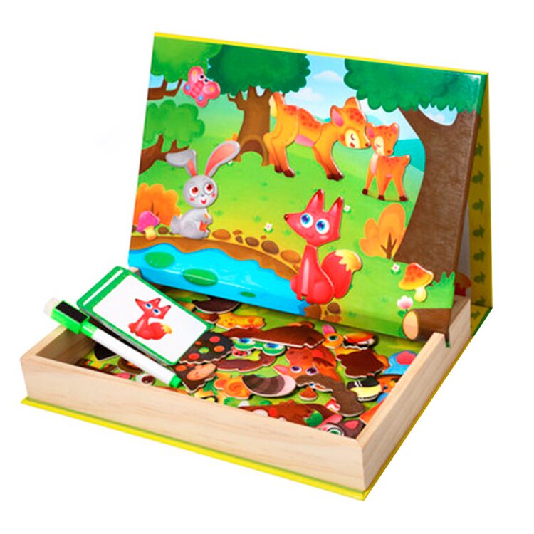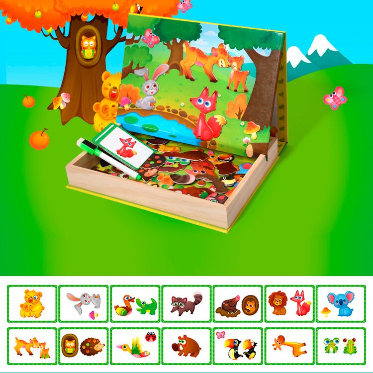 Набор фигурок на магните для развития логического мышления, фантазии. Из деталей набора можно сложить 14 картинок с различными животными. Игра оборудована 2-мя полями: магнитным и полем для рисования маркерами на водной основе. В набор входят магнитные детали, маркер - 1 шт., 7 двухсторонних карточек с картинками, чемоданчик с полями.