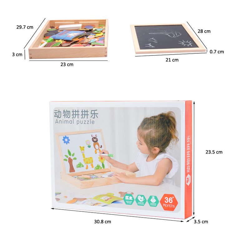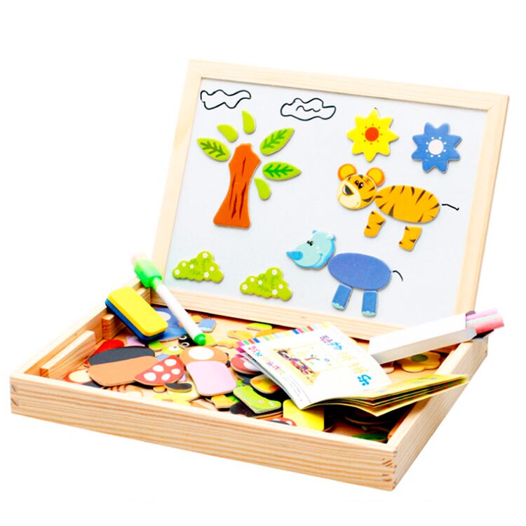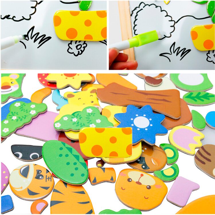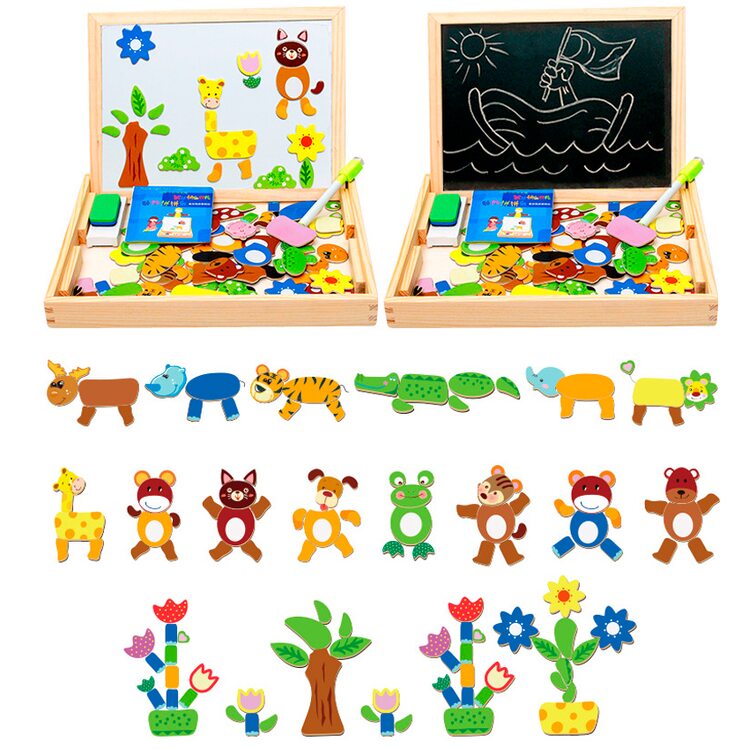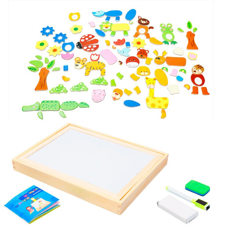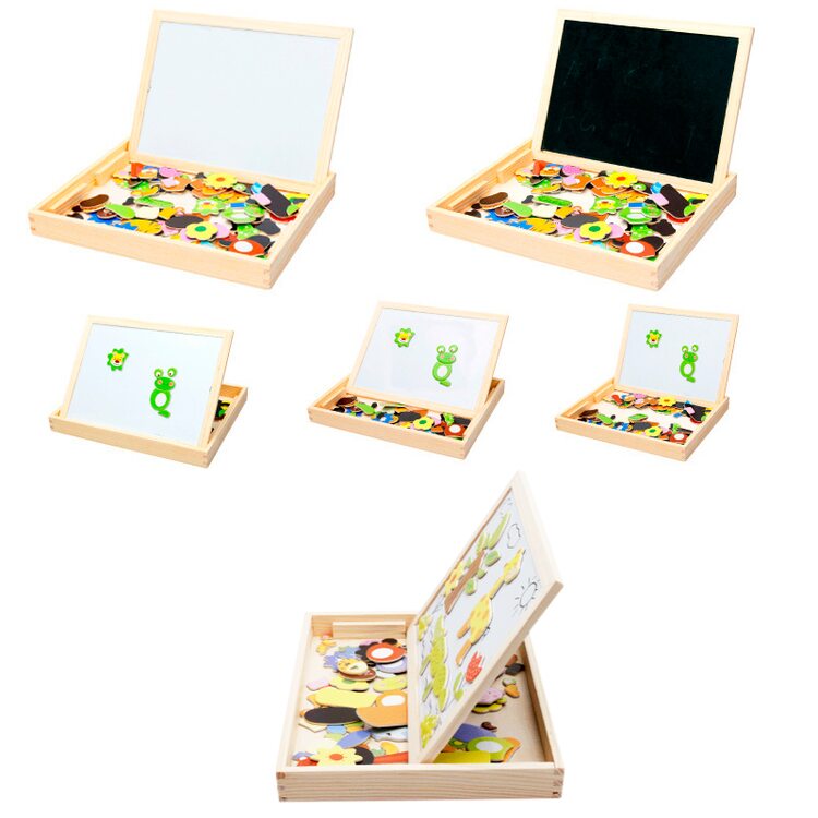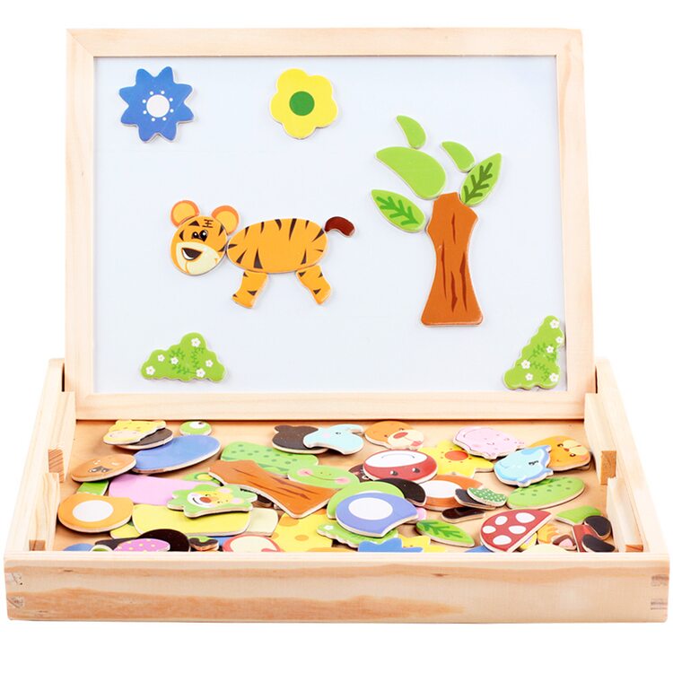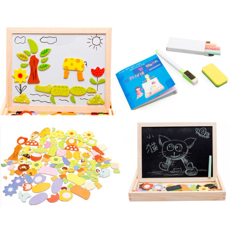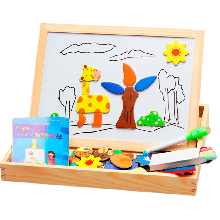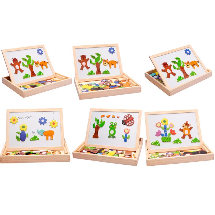 На магнитную сторону досточки выкладываем фигурки животных, растений, транспорта или других персонажей и получаем интересную картинку. Книжечка с примерами рисунков станет отличным помощником в создании мини шедевров.