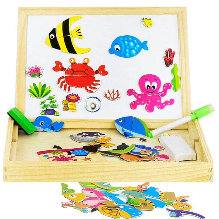 Хотите рассказать Вашему малышу о морских обитателях? С развивающей игрой чемоданчик с фигурками «Морская прогулка» это будет сделать наглядно и увлекательно. Ведь в наборе есть много интересных деталей. Например, верхняя доска состоит из двустороннего покрытия. На белой, магнитной стороне, легко расположить фигурки-магнитики животных и растений. С ними можно разыгрывать целые сценки. А с помощью маркера дополнять картинки яркими надписями. На обратной, грифельной, стороне, здорово писать и рисовать цветными мелками. Чтобы после игры из серии мольберт-доски поверхности для написания оставались чистыми, в комплекте предусмотрена специальная губка.